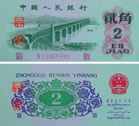 一是主題思想鮮明,內容相互呼應,極富民族特色。兩種原版的1角券正面均為“教育與生產勞動相結合”圖,只是一個是側視圖,一個是正視圖,象征文化教育新改革;2角券正面為武漢長江大橋圖,象征社會主義建設新成就;5角券正面為紡織車間圖,象征發展輕工業。三種面額角券背面分別采用菊花、牡丹花、梅花、棉花等組成的圖案,象征社會主義文化、科學、藝術百花齊放,欣欣向榮。1元券正面為女拖拉機手圖,象征農業為基礎,背面的羊群象征發展畜牧業;2元券正面為車床工人圖,象征工業為主導35元券正面為煉鋼工人圖,象征工業以鋼為綱;2、5元券背面的石油礦井和露天煤礦象征發展能源工業;10元券正面為 “人民代表步出大會堂”圖,象征人民參政議政,當家做主人,背面以紅色牡丹花和彩帶襯托天安門,象征偉大祖國的富強和團結。