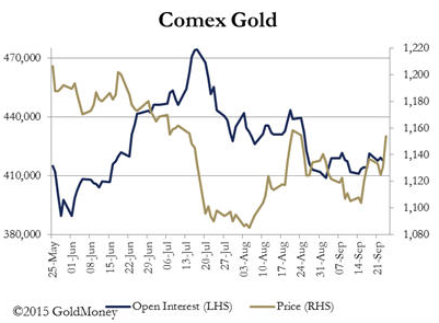 上周黃金市場(chǎng)出現(xiàn)了比較大的起伏,周初先是大幅走低,但此后受到避險(xiǎn)需求推動(dòng)大幅走高,一度觸及一個(gè)月高點(diǎn)。 在期金市場(chǎng),黃金的未平倉(cāng)合約數(shù)量有一些上漲,但這還不足以顯現(xiàn)黃金市場(chǎng)就此可以買(mǎi)入。 未平倉(cāng)合約和金價(jià)之間的分歧自8月初就開(kāi)始顯現(xiàn),因此上周的上漲并不算新鮮。
