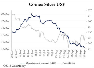 期銀市場(chǎng)的未平倉(cāng)合約數(shù)則在走低,銀價(jià)則有上漲,表明了同樣的分歧。 從上述分歧來(lái)看,黃金和白銀空頭在持續(xù)清倉(cāng)。 |